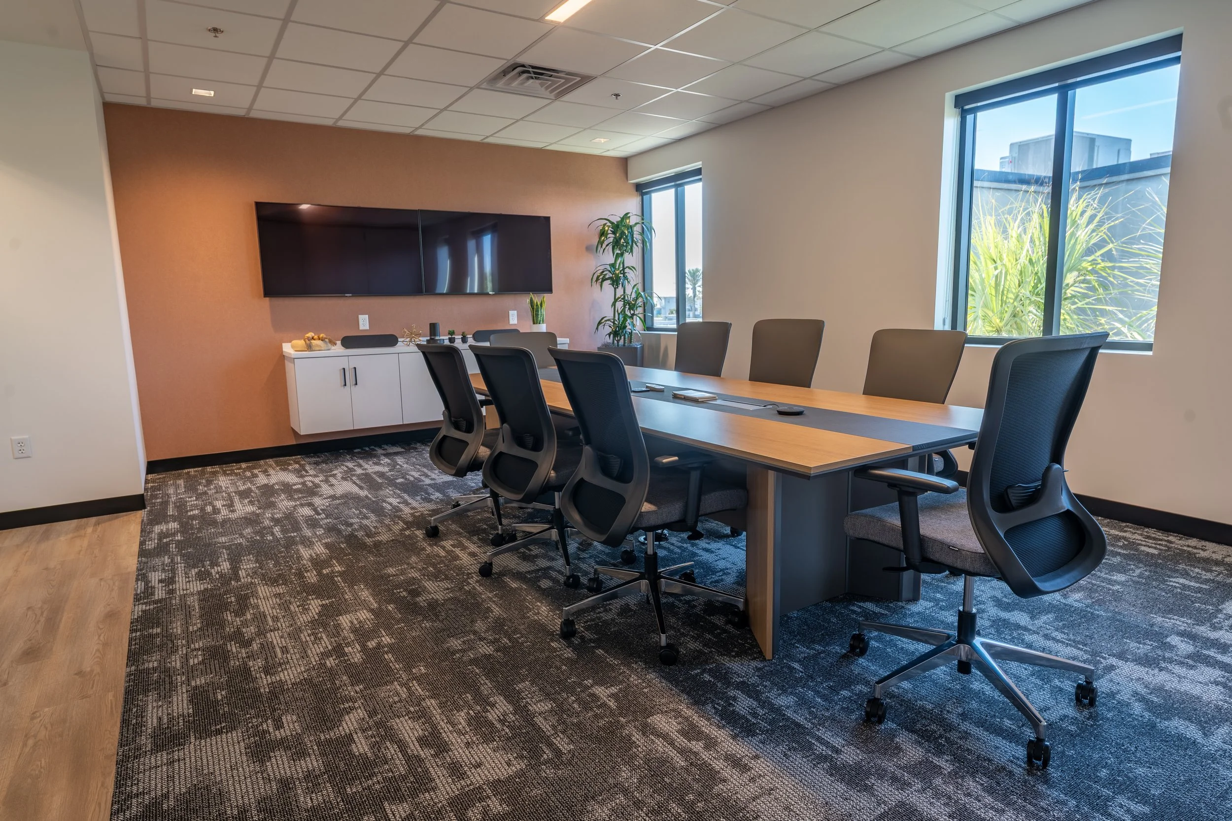 Biophilic elements: Incorporating natural elements into your office design helps to boost creative juices, reduce stress, and leads to a positive work environment. Adding natural lighting, greenery, and other natural elements into your workplace increases overall wellbeing.